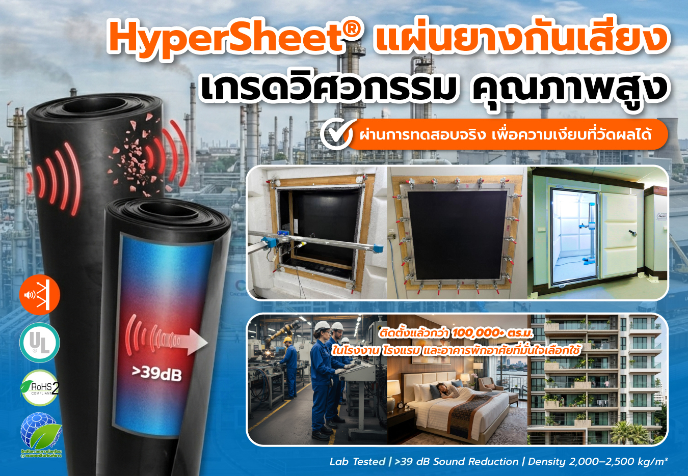 HyperSheet® นวัตกรรมแผ่นยางกันเสียงเกรดวิศวกรรม (Engineering Grade) ที่ออกแบบมาเพื่อแก้ไขปัญหาเสียงรบกวนในระดับโครงสร้างอย่างมีประสิทธิภาพ ที่ได้รับการพัฒนาสูตรยางที่มีมวลหนาแน่นสูงพิเศษ (High-Density Polymer) มีคุณสมบัติในการสะท้อนและดูดซับพลังงานเสียง และผ่านการทดสอบเรื่องเสียงจากห้อง LAB เฉพาะทาง ทำให้ HyperSheet® แผ่นยางกันเสียง เป็นวัสดุประเภท Sound Barrier ทรงประสิทธิภาพในการกันเสียงที่ได้รับการตอบรับเลือกใช้งานในโรงงานอุตสาหกรรมและโรงแรม คอนโด ที่พักอาศัยมากที่สุด