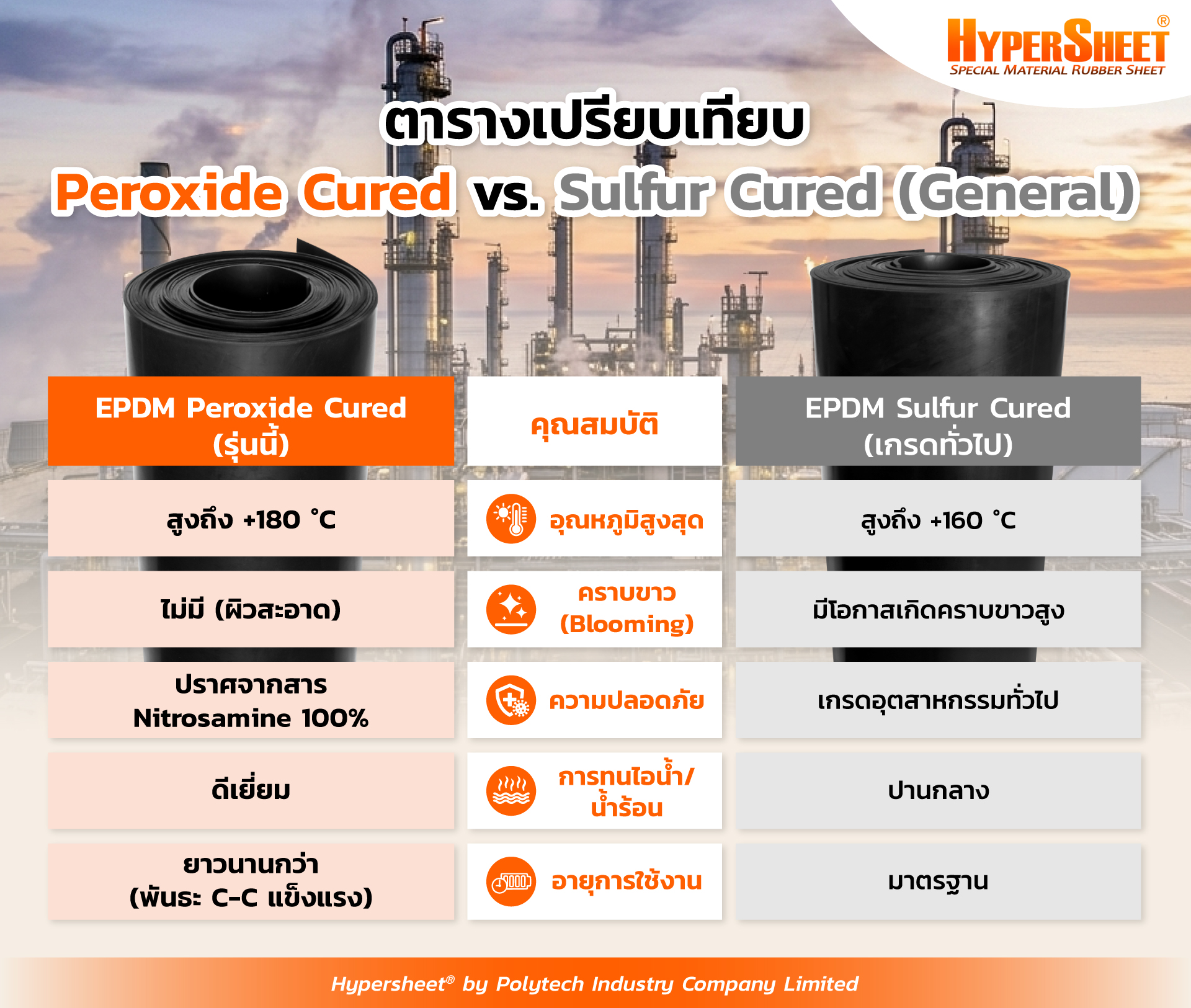 ยกระดับมาตรฐานการผลิตและการซ่อมบำรุงด้วย แผ่นยาง EPDM พรีเมียม ( Peroxide Cured) ภายใต้แบรนด์ Hypersheet นวัตกรรมยางสังเคราะห์เกรดพรีเมียมที่ผ่านกระบวนการ Cured ด้วยระบบ Peroxide 100% (Sulphur Free) แตกต่างจากยาง EPDM ทั่วไปในท้องตลาดอย่างสิ้นเชิง