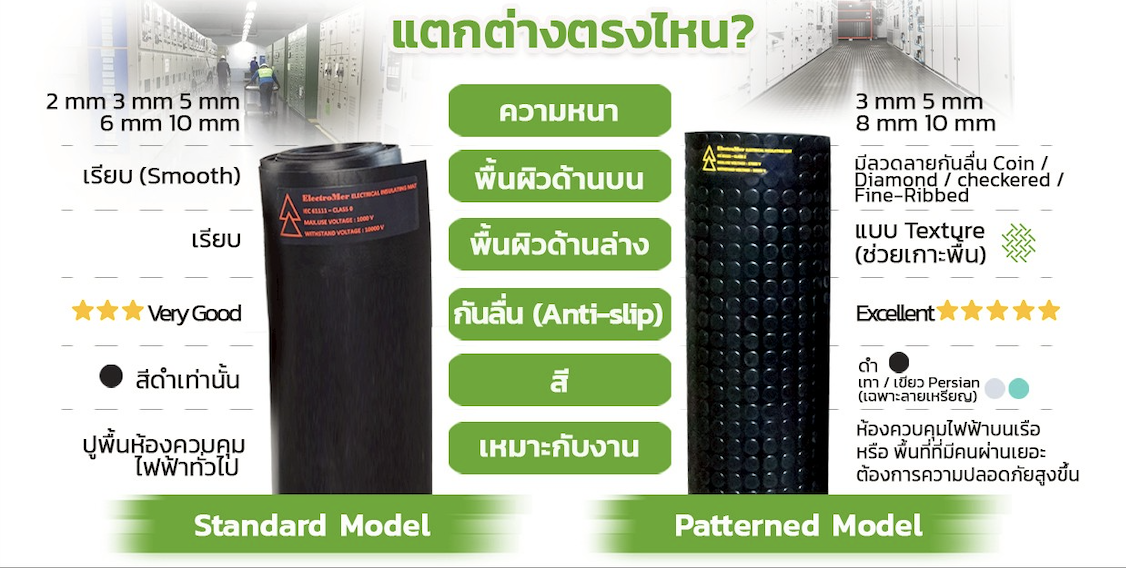 ElectroMer® ในฐานะแบรนด์ชั้นนำด้านแผ่นยางฉนวนไฟฟ้าระดับอุตสาหกรรม ได้นำเสนอผลิตภัณฑ์ 2 รุ่นยอดนิยม ได้แก่ Standard Model และ Patterned Model ซึ่งแม้จะมีคุณสมบัติการป้องกันไฟฟ้าเทียบเท่ากัน แต่แตกต่างกันอย่างชัดเจนในด้านการใช้งานจริง