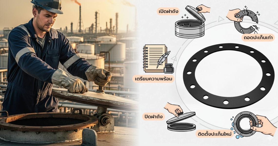 A5 : ทำความสะอาดถังและพื้นที่โดยรอบ ถอดปะเก็นเก่าออก ทำความสะอาดร่องปะเก็น ใส่ปะเก็นใหม่ให้ถูกตำแหน่งไม่บิดงอ และขันน็อตฝาถังให้แน่นอย่างสม่ำเสมอ