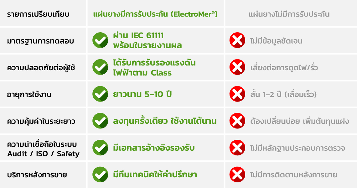 แต่สิ่งที่แตกต่างคือ — แผ่นยางฉนวนไฟฟ้ามาพร้อมใบรับรองมาตรฐาน IEC 61111 และ “การรับประกันสินค้า” จากแบรนด์ ElectroMer®