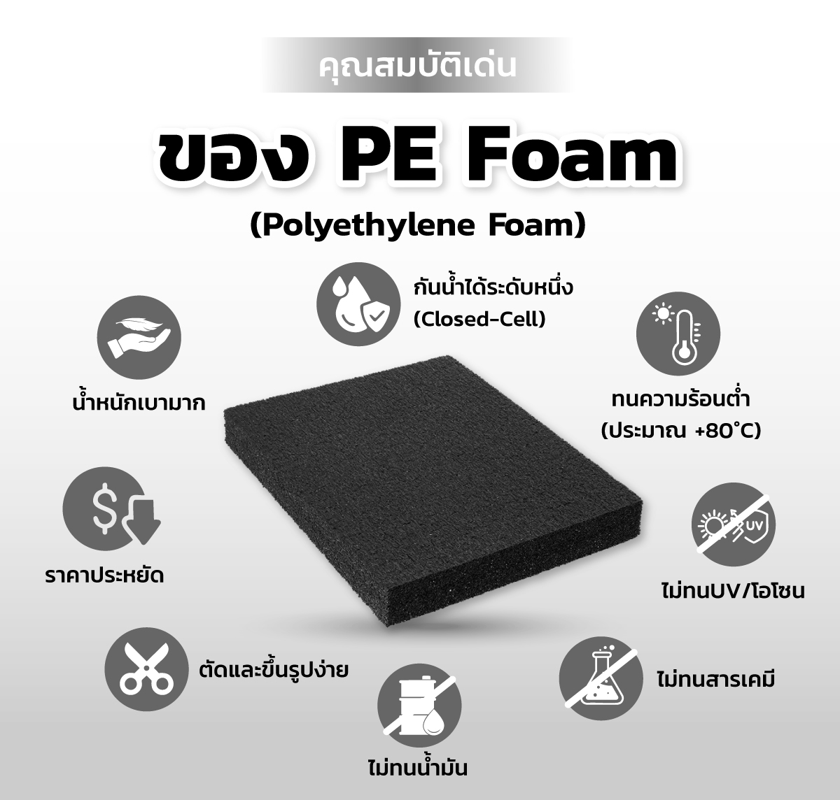 PE Foam (Polyethylene Foam) คือโฟมพลาสติกชนิด Closed-Cell ที่มีน้ำหนักเบา ต้นทุนต่ำ และใช้งานง่าย จึงนิยมนำไปใช้ในงานที่ไม่ต้องการความทนทานสูง