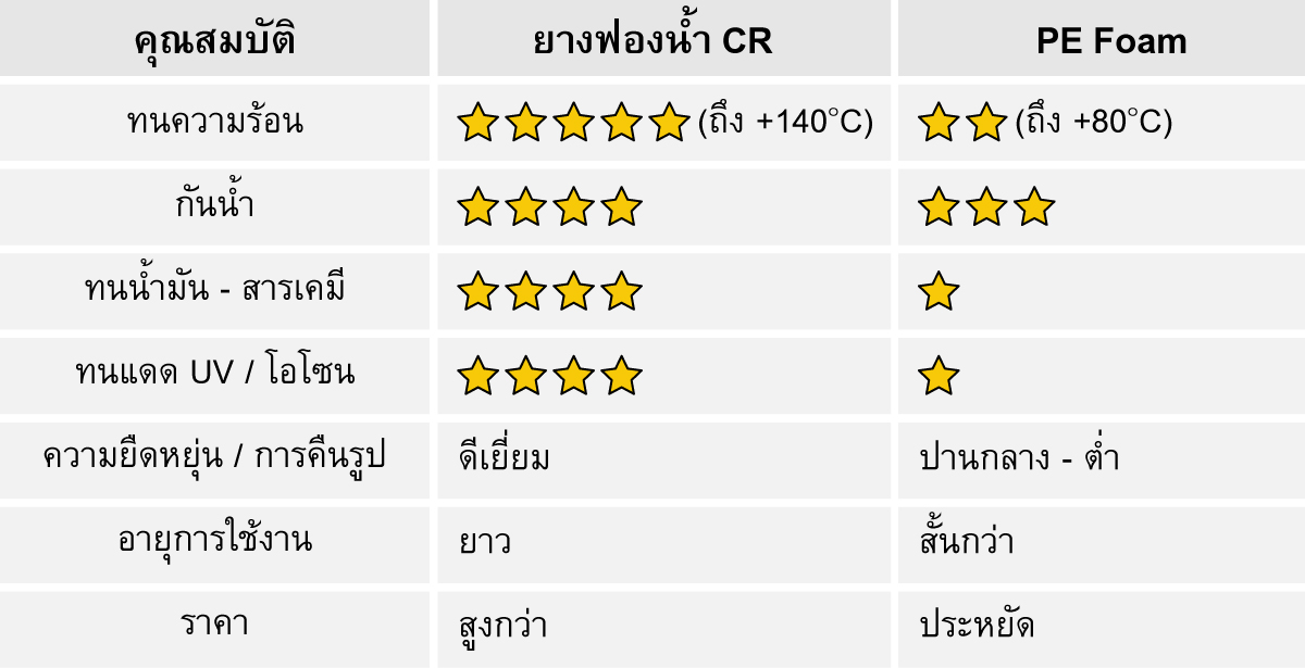 ตารางเปรียบเทียบยางฟองน้ำ CR และ PE Foam