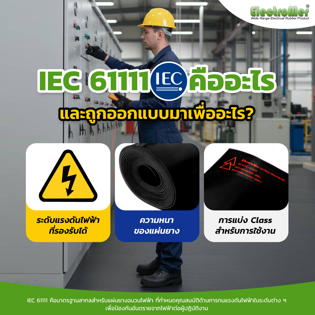 IEC 61111 คือมาตรฐานสากลสำหรับแผ่นยางฉนวนไฟฟ้า ที่กำหนดคุณสมบัติด้านการทนแรงดันไฟฟ้าในระดับต่าง ๆ เพื่อป้องกันอันตรายจากไฟฟ้าต่อผู้ปฏิบัติงาน โดยเนื้อหาหลักครอบคลุมถึง: