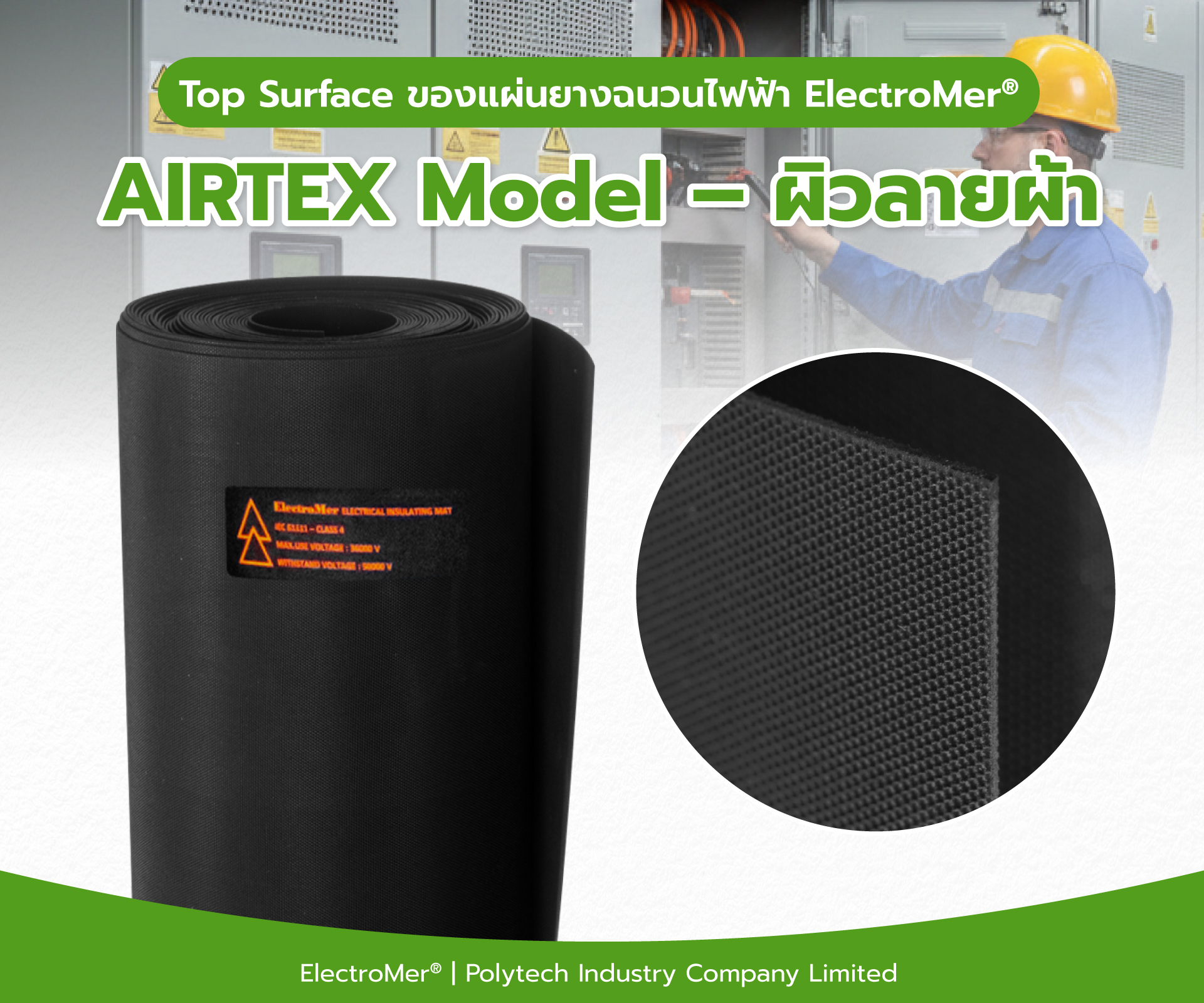 แผ่นยางฉนวนไฟฟ้า AIRTEC MODEL เป็นเป็นยางฉนวนไฟฟ้าที่มีผิวด้านบนเป็น ลายผ้า (Fabric Texture) ให้ความรู้สึก เรียบ สม่ำเสมอ เป็นระเบียบ พร้อมคุณสมบัติกันลื่นในระดับที่เหมาะสม