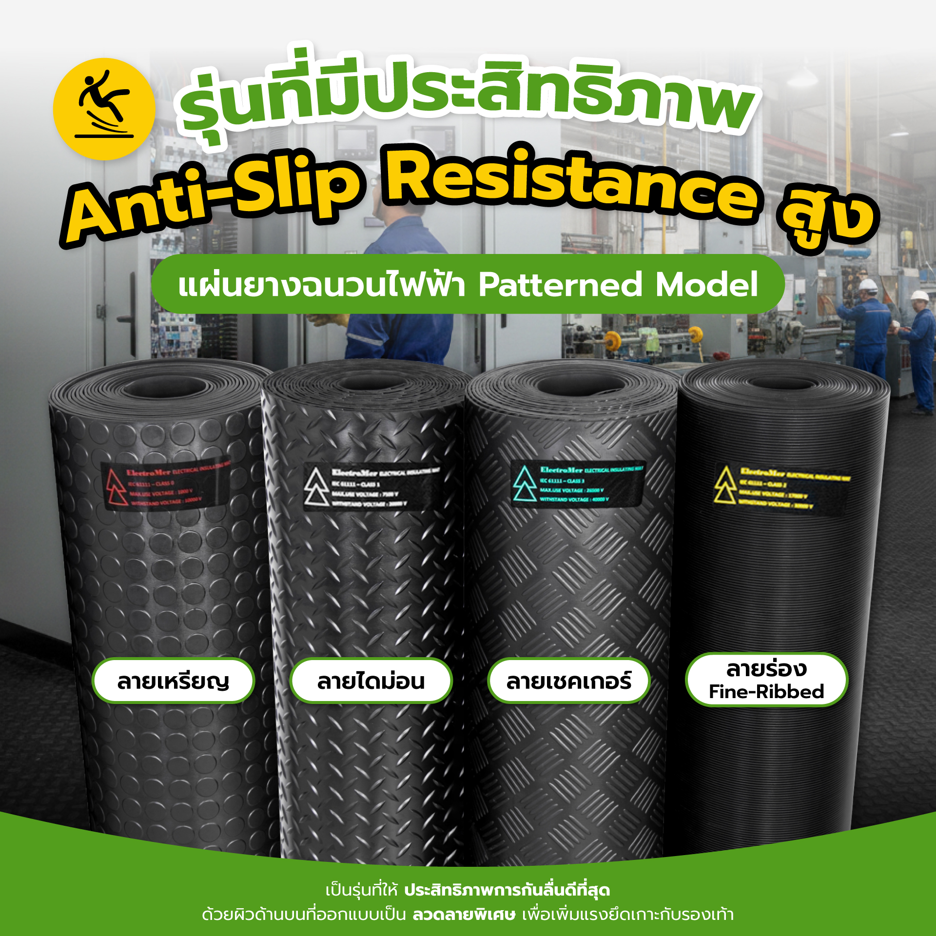 แผ่นยางฉนวนไฟฟ้า ElectroMer ทุกรุ่นถูกออกแบบให้มี คุณสมบัติกันลื่นในระดับที่เหมาะสมกับการใช้งานในห้องไฟฟ้า ช่วยเพิ่มความมั่นคงในการ ยืน เดิน และปฏิบัติงาน ได้อย่างปลอดภัย