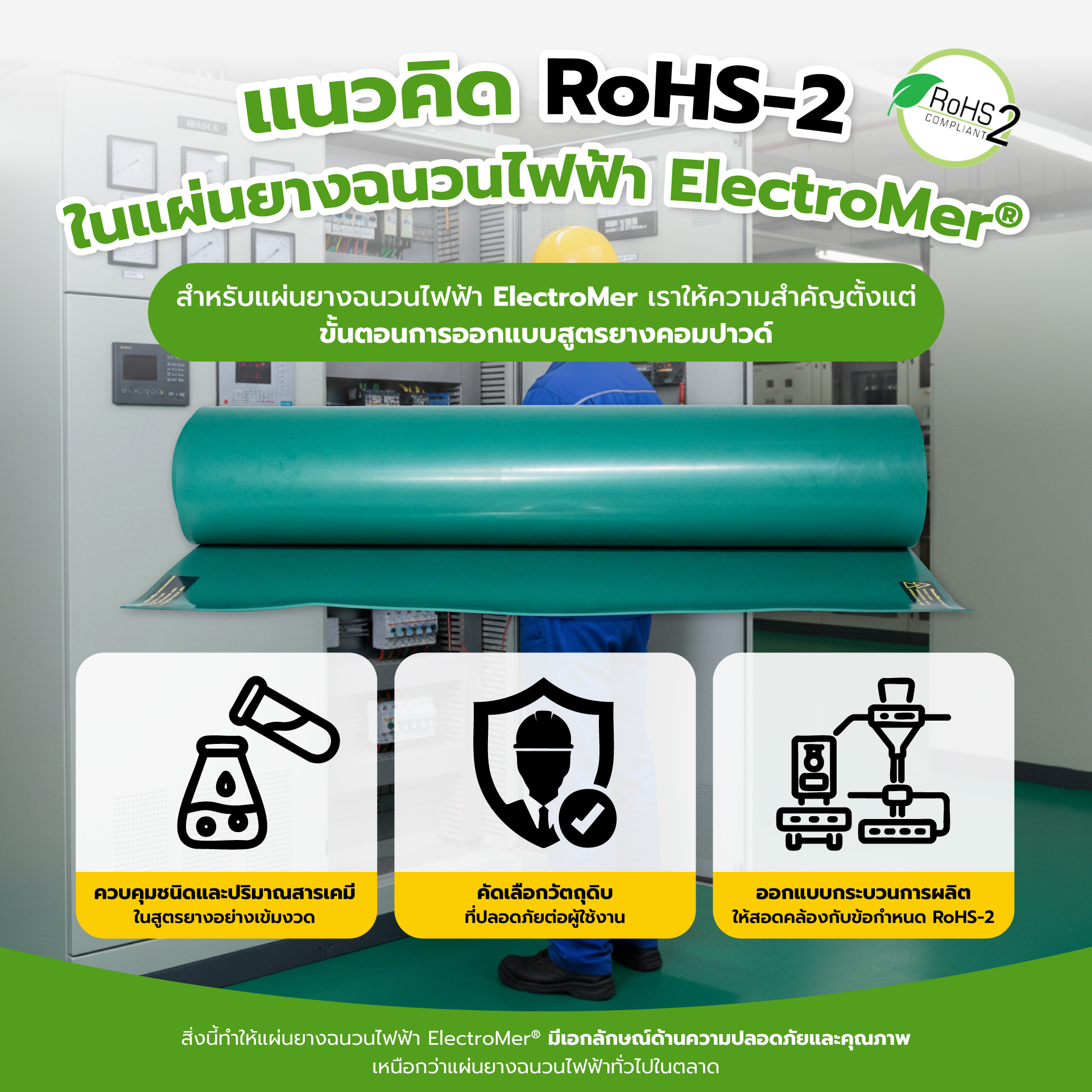 แผ่นยางฉนวนไฟฟ้า ElectroMer® ผ่านมาตรฐาน RoHS-2 และ ไม่ใช้สารอันตรายต่อสุขภาพและสิ่งแวดล้อม เช่น