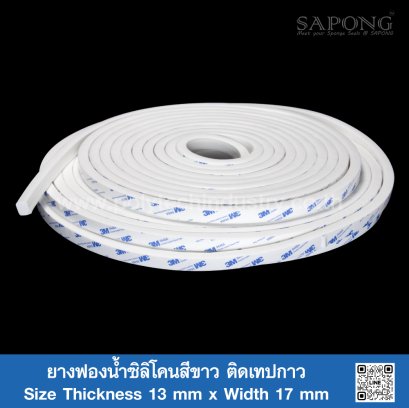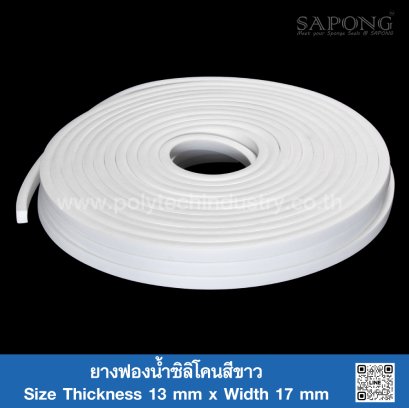 White Silicone Sponge Rubber Self-Adhesive Tape Size Thickness 13 mm x Width 17 mm Resistant to heat up to +270°C, food grade (FDA), no contaminants. Highly flexible, recovers well, does not lose shape. Excellent resistance to the environment, UV Ozone, sunlight, safe for use in industry / Tel : 0-2257-7154 / MB : 086-307-7319 / Line OA : @PTIRUBBER