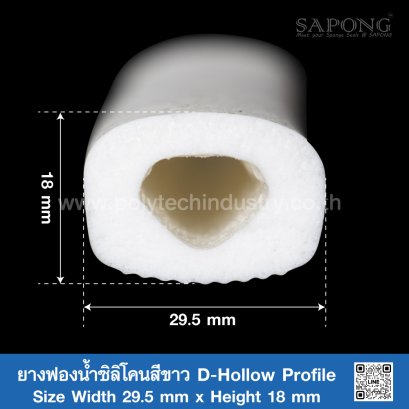 White Silicone Sponge Rubber D-Hollow Profile Size Width 29.5 mm x Height 18 mm Resistant to heat up to +220°C , food grade (FDA), no contaminants. High flexibility, good recovery, not deformed Resistant to UV Ozone environment, excellent sunlight, safe to use for industry Tel : 0-2257-7154 / MB : 086-307-7319 / Line OA : @PTIRUBBER