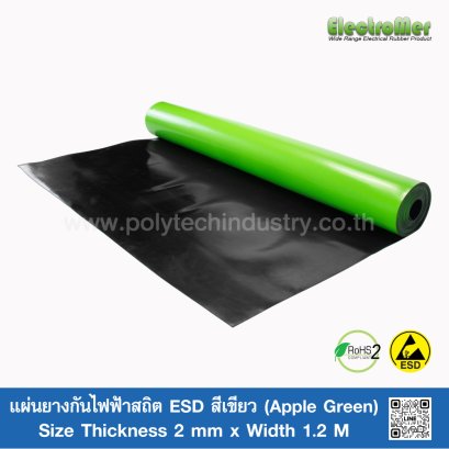 Green Antistatic Rubber Sheet (ESD) Size Thickness 2 mm x Width 1.2 m produced in matte and glossy surfaces. Anti-Static, ESD, Excellent Dissipation, Scratch Resistant, Wear Resistant, Tear Resistant, Excellent Oil and Chemical Resistance Tel : 0-2257-7154 / MB : 086-307-7319 Line OA : @PTIRUBBER