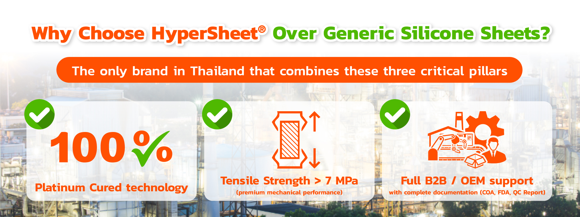 HyperSheet® is the only brand in Thailand that develops and supplies true Platinum Cured Silicone Rubber Sheets specifically for industrial applications.