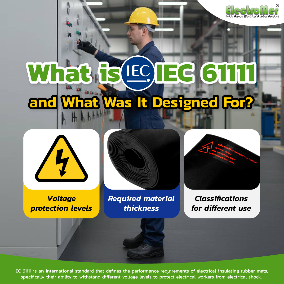 IEC 61111 is an international standard that defines the performance requirements of electrical insulating rubber mats, specifically their ability to withstand different voltage levels to protect electrical workers from electrical shock.