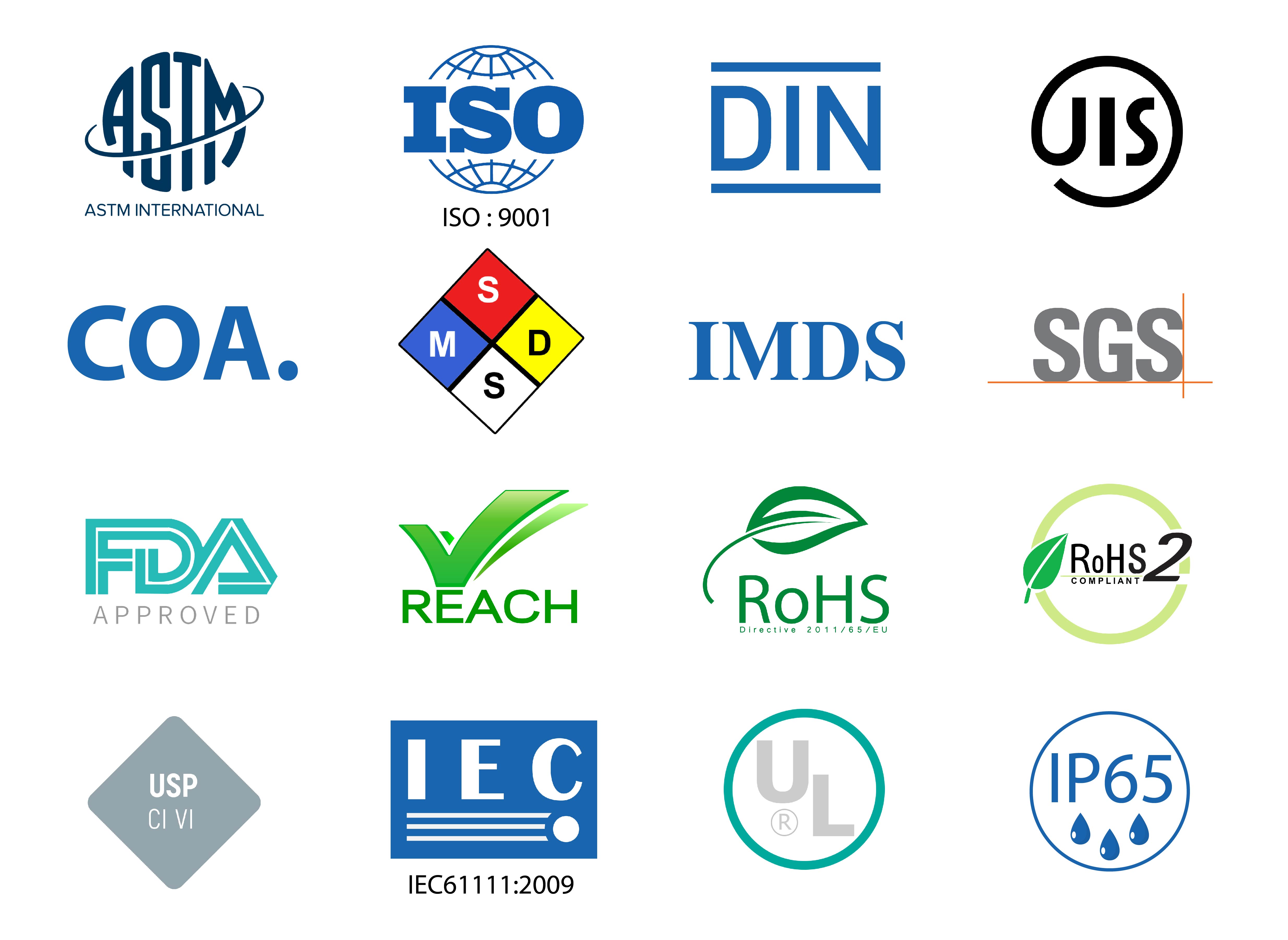 PTI We control the quality of rubber and plastic parts products before delivery. So that the products are manufactured to the standards in accordance with Spec. Before delivery to the hands of customers We control standards from compound tires. Production process Testing various properties Including specialized tests We have both IN-HOUSE and Third-party tests from specialized testing institutions in accordance with ASTM, ISO: 9001, DIN, JIS. COA. MSDS, IMDS, FDA, REACH, RoHS, RoHS2, UL, IEC certifications are available for your confidence. Quality of rubber product components and pass the export standard