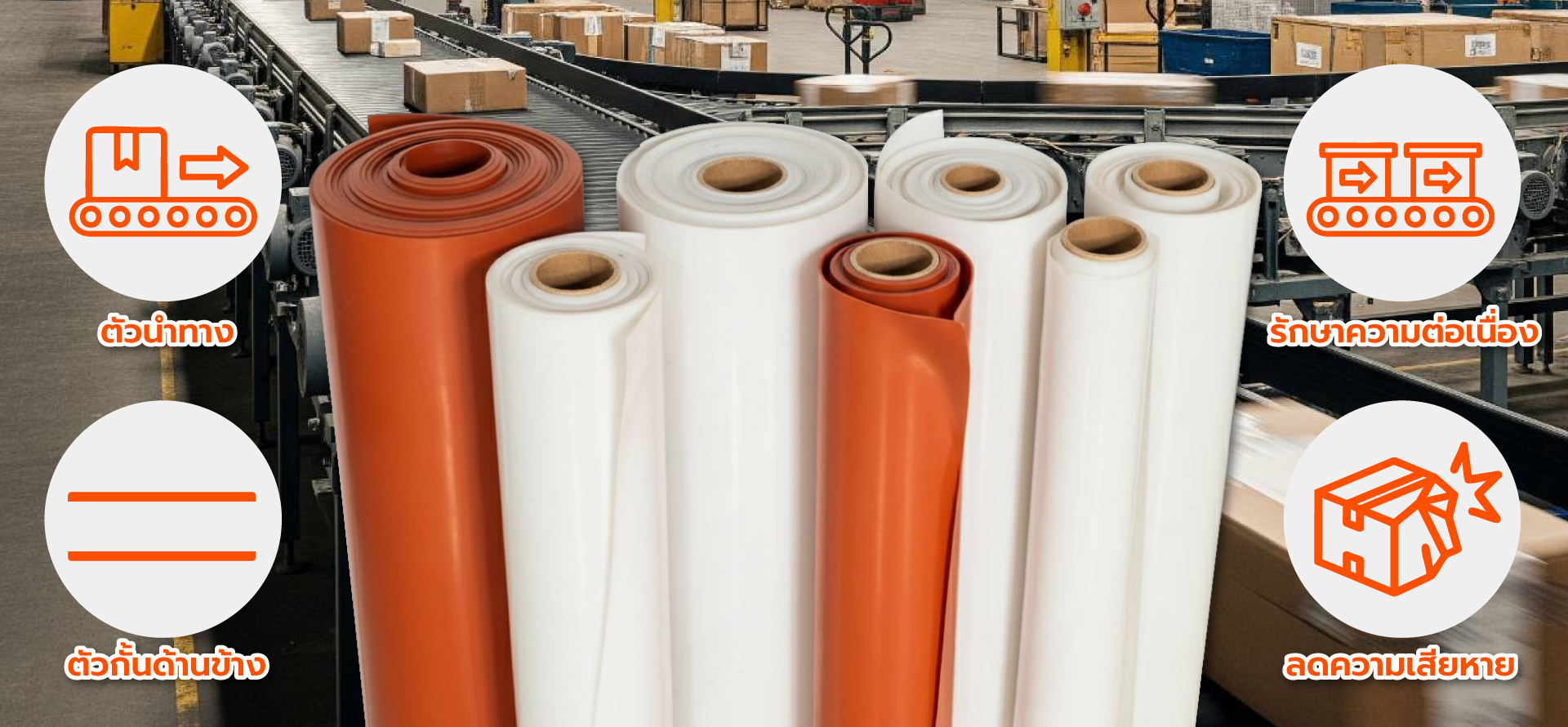 แผ่นยางซิลิโคนไกด์สายพาน คือ ชิ้นส่วนสำคัญที่ติดตั้งด้านข้างหรือด้านล่างของสายพานลำเลียง ทำหน้าที่เป็นตัวนำทาง (Guide) เพื่อให้สายพานและสินค้าเคลื่อนที่ได้ตรงแนว ป้องกันการเบี่ยง การตกหล่น หรือการชนกันของบรรจุภัณฑ์ในไลน์ผลิต